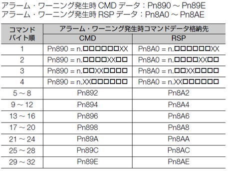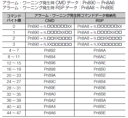 ■MECHATROLINK-Ⅱ(アラームとワーニング発生時の通信データモニタ) ![]() ※コマンドの詳細については、下記コマンドマニュアルを参照ください。 https://www.e-mechatronics.com/download/manual/download.html?qCategory=%E3%82%B5%E3%83%BC%E3%83%9C&qLang=en&qTarget=103 ■MECHATROLINK-Ⅲ(アラームとワーニング発生時の通信データモニタ) ![]() ※コマンドの詳細については、下記標準サーボプロファイルコマンドマニュアルを参照ください。 https://www.e-mechatronics.com/download/manual/download.html?qCategory=%E3%82%B5%E3%83%BC%E3%83%9C&qLang=en&qTarget=105 |