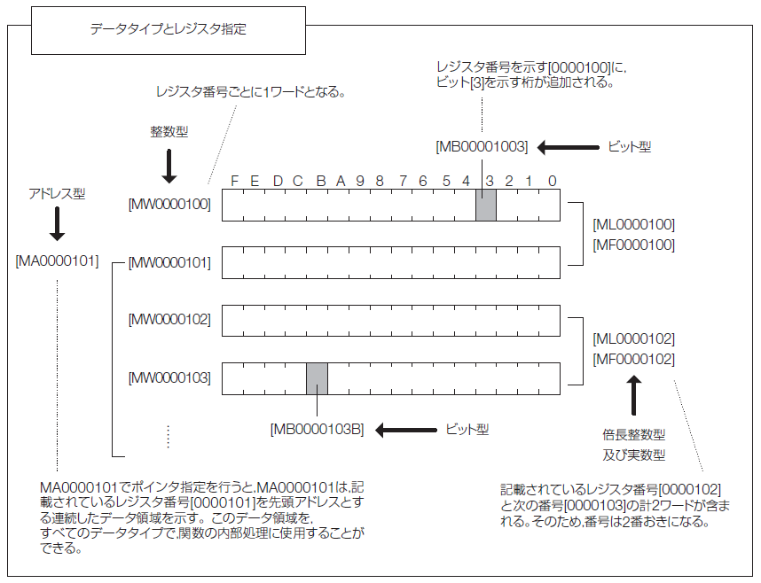 例えばビット型MB00001003の場合は、整数型MW0000100の3ビット目を意味しています。