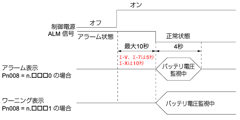 ・Pn008 = n.□□□0に設定した場合 制御電源を投入し、サーボアラーム出力(ALM)信号が最大5秒間(Σ-Xは10秒間)出力された後、4秒間バッテリ電圧 を監視します。 4秒以降にバッテリ電圧が規定値以下に下がったとしてもアラームは表示されません。 ・Pn008 = n.□□□1に設定した場合 制御電源を投入し、サーボアラーム出力(ALM)信号が最大5秒間(Σ-Xは10秒間)出力された後、常時バッテリ電圧 を監視します。 ![]() |